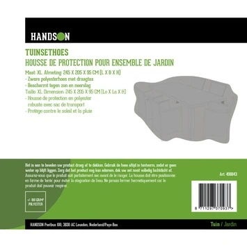 Met deze Handson Tuinsethoes 280x205x95 cm bescherm je jouw tuinset tegen vuil en regen. Deze hoes heeft een afmeting van 280x205x95 cm en is gemaakt van polyester. Ook weert de hoes UV-licht en is waterafstotend. Zorg dat de hoes aan de onderkant een beetje open blijft, hierdoor kunnen de tuinmeubelen blijven ademen, dit voorkomt eventuele schimmelvorming. Inclusief draagtas voor de hoes.
